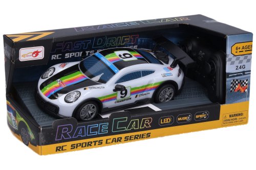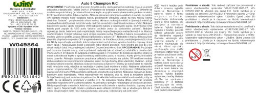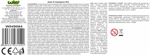 Auto 9 Champion svietiaci dymiaci RC na diaľkové ovládanie. Rozmery 19x8x6 cm. Frekvencia 2.4GHz. Svetelné efekty povrchu auta. Fajčiace efekty. Batériový pack 3.7V 500mAh do auta súčasťou, 2xAA do ovládača nie sú súčasťou. USB kábel súčasťou. Prepínač ON/OFF na spodnej strane obalu. Ovládač - prepínač ON/OFF, tlačidlo - dymiace efekty, tlačidlo - zvukové efekty. Nádržka na vodu v zadnej časti auta pred krídlom.