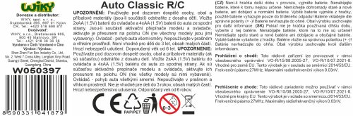Auto Classic RC na diaľkové ovládanie. Rozmery 29x22x21 cm. Frekvencia 27MHz. 4xAA batérie do auta, 2xAA do ovládača nie sú súčasťou. Prevádzka 15-20 min, dosah 10-15 m. Prepínač ON/OFF na spodnej strane auta a na ovládači.
