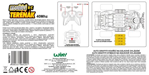 Auto terénne graffiti RC na diaľkové ovládanie. Rozmery 24x14,5x10,6 cm. Frekvencia 40 MHz. Svetelné a dymové efekty. 4xAA batérie do auta a 2xAA batérie do ovládača nie sú súčasťou. Prepínač ON/OFF na spodnej strane auta. Voda sa plní na zásobníku v hornej zadnej časti auta. Nádobka na vodu súčasťou. Tlačidlo medzi páčkami na ovládači - stlačenie aktivácie dymu - dvojité stlačenie vypnutia dymu.