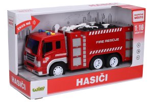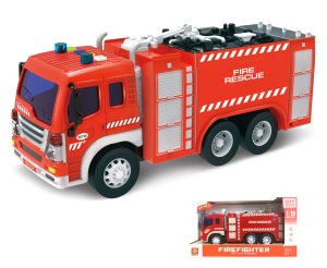 Auto hasičské so striekačkou a efektmi. Veľkosť 28 cm. Na zotrvačník. Svetelné a zvukové efekty - tlačidlá na kabíne. 3xAG13 batérie súčasťou.