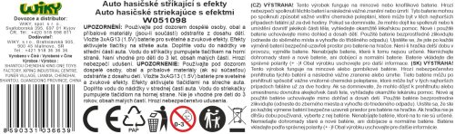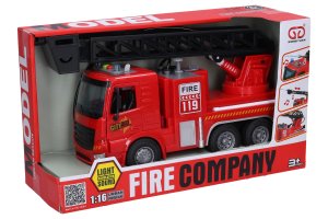 Auto hasičské striekajúce s efektmi. Veľkosť 30 cm. Na zotrvačník. Vydáva svetelné a zvukové efekty, aktivácia tlačidlami na kabíne. 3xAG13 batérie do strechy kabíny súčasťou. Nádržka na vodu sa nachádza vo vnútri cisterny, zaistená zátkou na streche. Striekanie tlačidlom na nádržke.