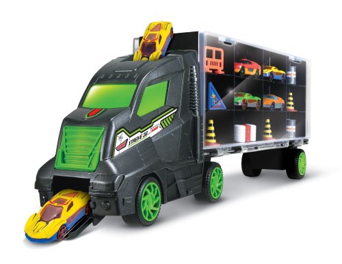 Auto kamión s autami. Veľkosť kamiónu 48 cm, áut 7 cm. Kabína kamiónu prejazdná autami. Súčasťou kamión s voľnými kolesami, úložnou plochou a držadlom, 4 autá s voľnými kolesami, barely, kužele, zábrana.