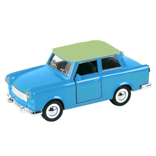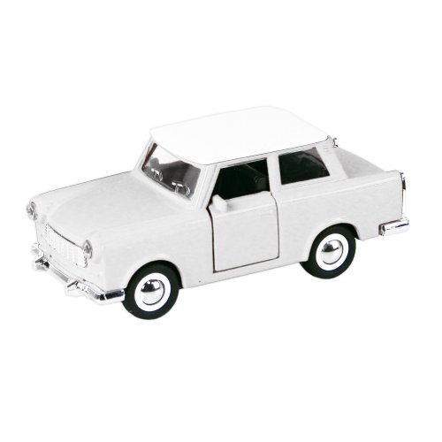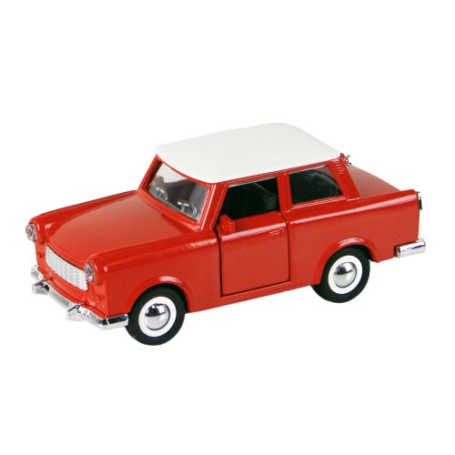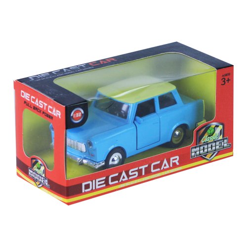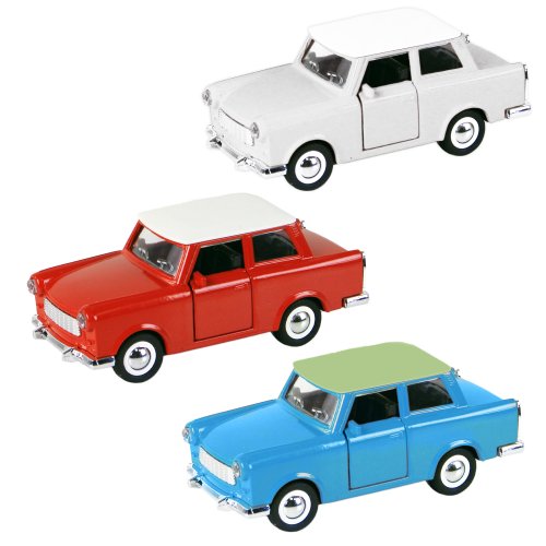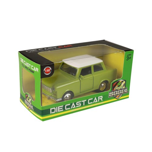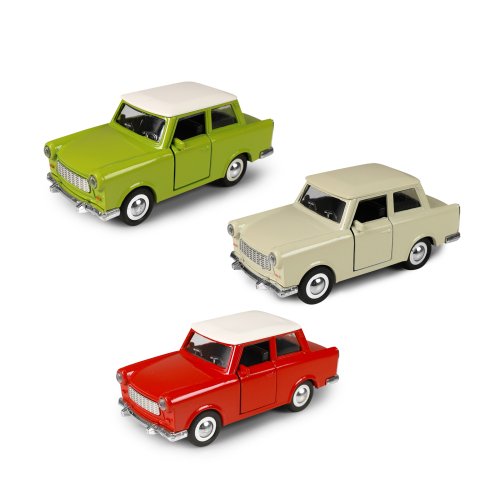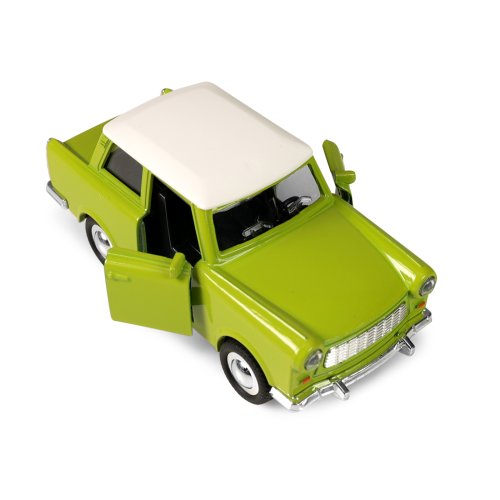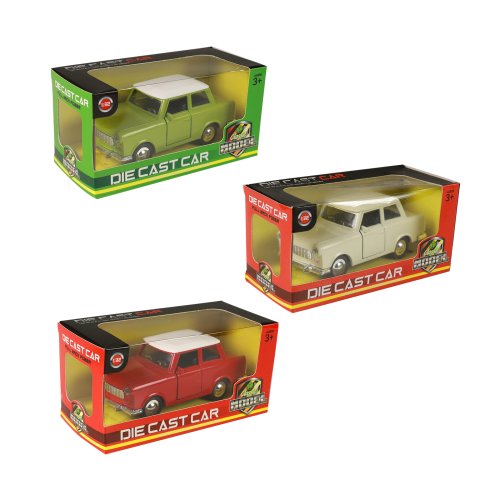 Senzačné kovové retro auto Trabant na spätný zotrvačník, má otváracie dvere a jeho dĺžka je cca 12 cm. Táto hračka je skvelým darčekom pre všetkých zberateľov autíčok!