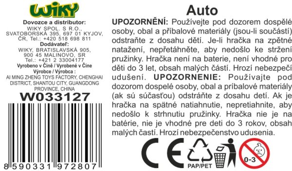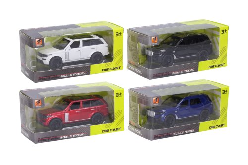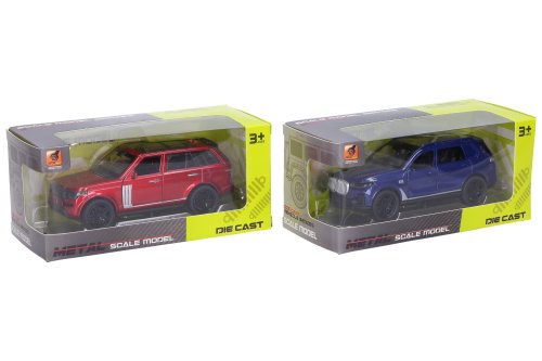 Auto kovové. Rozmery 12x5,3x4,9 cm. Na spätné natiahnutie. Otváracie predné dvere a kufor. Bez svetelných a zvukových efektov. 4 varianty - čierna, červená, modrá, biela.