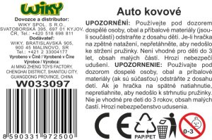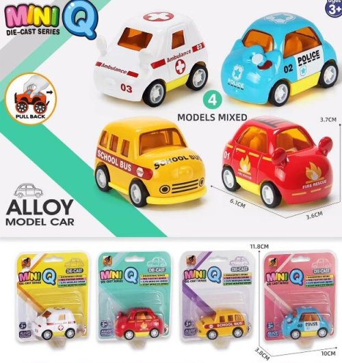 Auto kovové. Rozmery 6,1x3,6x3,7 cm. Na spätné natiahnutie. 4 varianty - záchranka, polícia, školský autobus, hasiči.