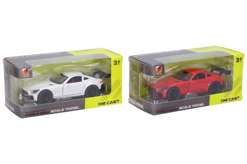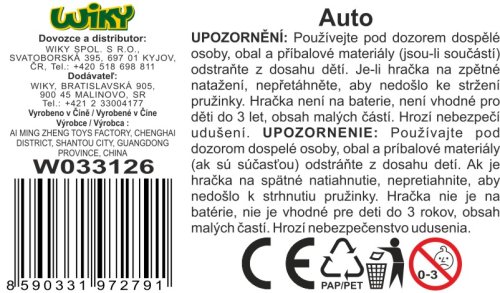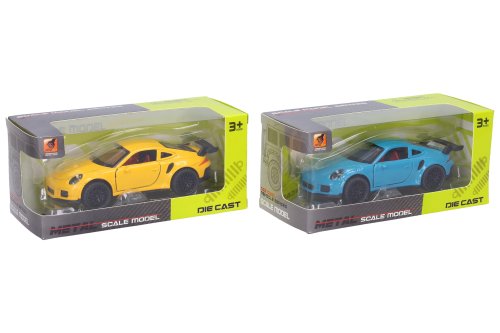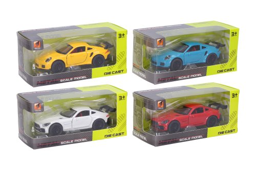 Auto kovové. Rozmery 12x5,2x3,6 cm. Na spätné natiahnutie. Otváracie dvere a zadné okno. Bez svetelných a zvukových efektov. 4 varianty - červená, žltá, biela, modrá.