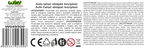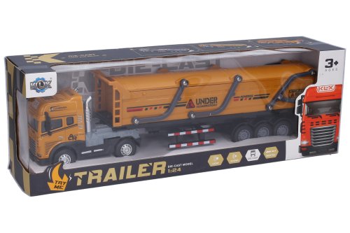 Auto kovové ťahač sklápač na zotrvačník s efektmi. Dĺžka 42 cm. Na zotrvačník. Vydáva svetelné a zvukové efekty. Aktivácia pohybom predných kolies. Páčka na uzamknutie návesu. Náves je možné odpojiť. Batéria 3xAG13, súčasťou balenia.