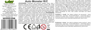 Auto Monster RC na diaľkové ovládanie. Rozmery 29x22x21 cm. Frekvencia 27MHz. 4xAA batérie do auta, 2xAA do ovládača nie sú súčasťou. Prevádzka 15-20 min, dosah 10-15 m. Prepínač ON/OFF na spodnej strane auta a na ovládači.