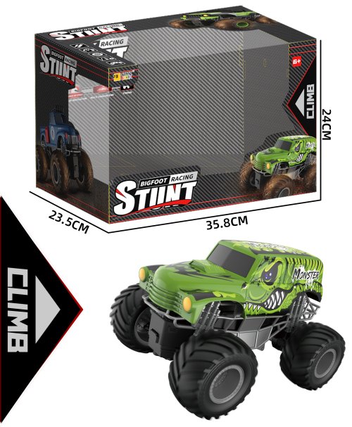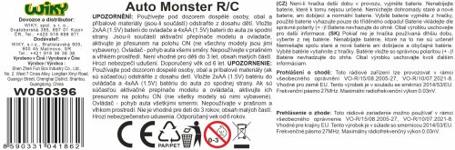 Auto Monster RC na diaľkové ovládanie. Rozmery 29x22x21 cm. Frekvencia 27MHz. 4xAA batérie do auta a 2xAA batérie do ovládača nie sú súčasťou. Prevádzka 15-20 min, dosah 10-15 m. Prepínač ON/OFF na spodnej strane auta a na ovládači.
