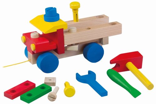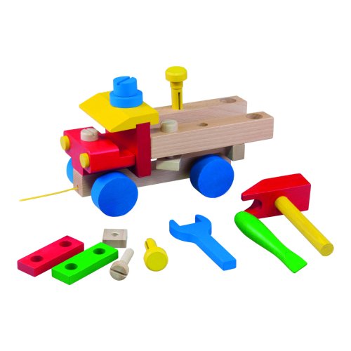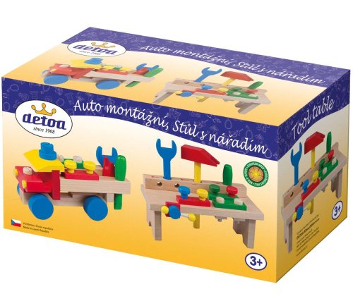 Drevené ťahacie montážne auto je zložené z montážnych častí a priloženého dreveného náradia.