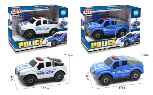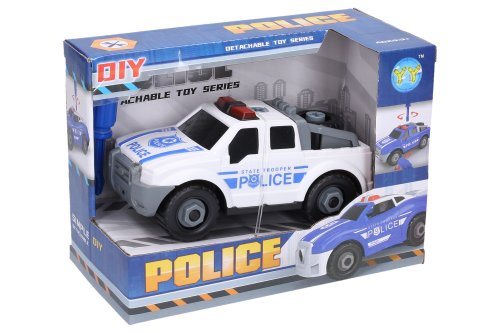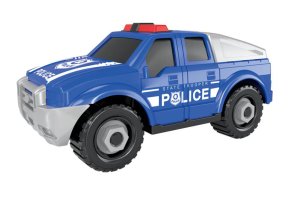 Auto pick-up polícia skrutkovacie. Rozmery 17x8x7,5 cm. Voľné kolesá. Balenie obsahuje auto a krížový skrutkovač. V rukoväti skrutkovača je kľúč na matice. 2 varianty - biela, modrá.