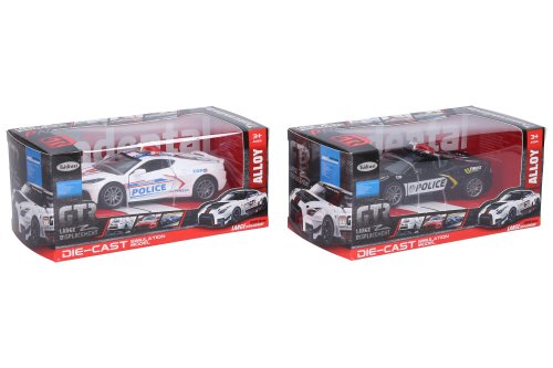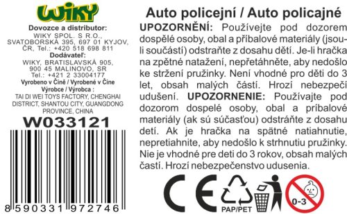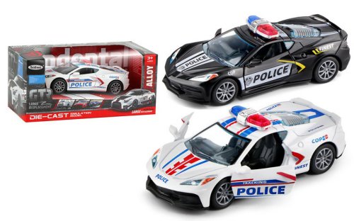 Auto policajné kovové. Rozmery 12x5,3x3,8 cm. Na spätné natiahnutie. Otváracie dvere. 2 varianty - čierna, biela.