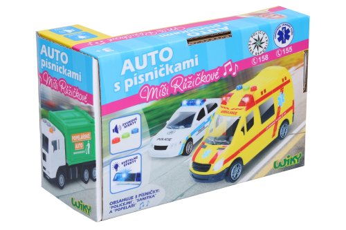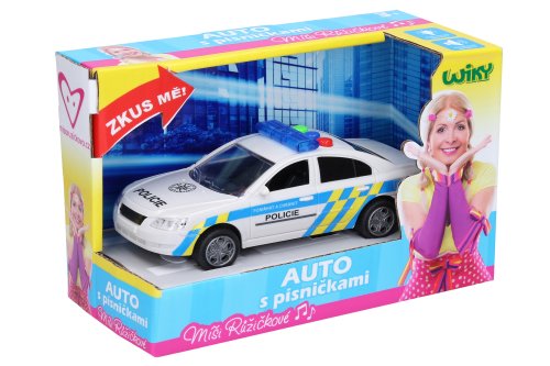 Auto policajné - Míša Růžičková. Veľkosť 15,5 cm. Na zotrvačník. Svetelné a zvukové efekty, tlačidlami na streche auta 3 pesníčky Míši Růžičkové - Policajné, Sanitka, Smetiari. 3xAG13 batérie súčasťou.