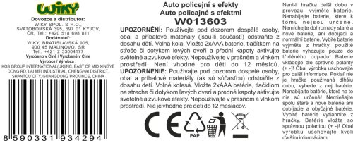 Auto policajné s efektmi. Veľkosť 15cm. Svetelné a zvukové efekty. Voľné kolesá. 2xAAA batérie súčasťou.