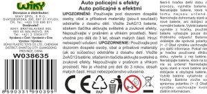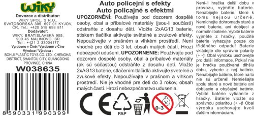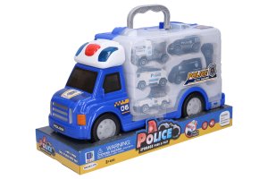 Auto policajné s efektmi a 6 malými autami. Rozmery veľkého auta 34x12, 5x18, 5 cm, veľkosť malých áut 7-8 cm. Voľné kolesá. Svetelné a zvukové efekty červeným tlačidlom na kabíne. 2xAG13 batérie súčasťou. Obsahuje veľké auto, 6 malých áut, semafor, fotobunku, kužeľ, závoru.