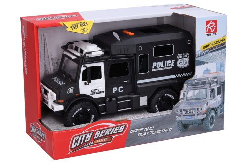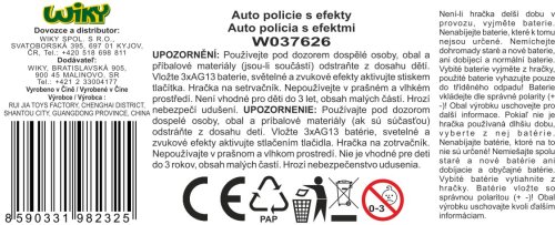 Auto polícia s efektmi. Veľkosť 23cm. zvukové (zvuk motora, cúvanie, maják) a svetelné efekty. Batéria 3xAG13 súčasťou. Zotrvačník.