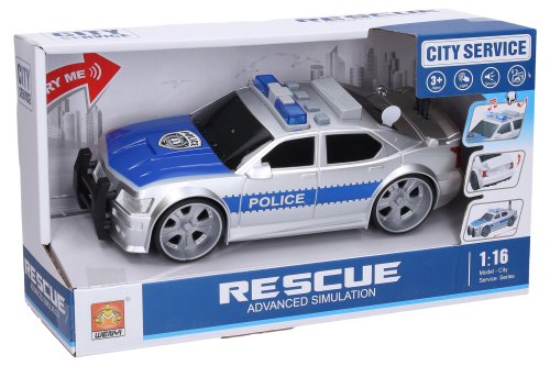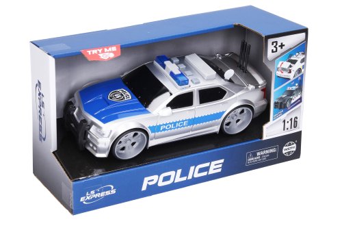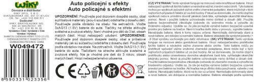 Auto polícia s efektmi na zotrvačník. S otváracím kufrom, otvára sa tlačidlom na streche auta. Rozmery 27,2x9,1x11 cm. Vydáva svetelné a zvukové efekty, aktivácia tlačidlami na streche (zvuk motora, cúvanie, trúbenie, maják). Batéria 3xAG13, súčasťou balenia.