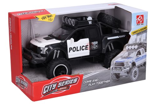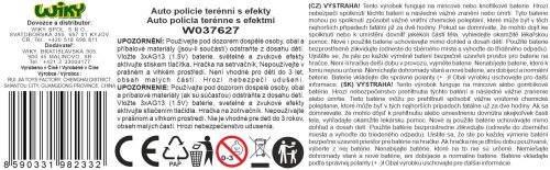 Auto polícia terénne s efektmi. Veľkosť 26 cm. Vydáva svetelné a zvukové efekty. Aktivácia tlačidlami na streche, zvuky cúvania, trúbenia, motor, štartovanie motora. Batéria 3xAG13 súčasťou. Na zotrvačník.