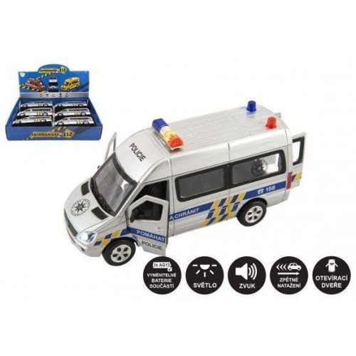 Kovové autíčko pre malých policajtov je vyrobené s plastovými doplnkami. Malý model jazdí na spätné natiahnutie, má otváracie predné a zadné dvere, vydáva zvuky štartovania a húkačky, má efekty blikajúcich svetiel. Kúpte deťom policajné auto! Veľkosť dodávky je 15cm. Batérie 3 x AG13 sú súčasťou balenia a slúžia iba na skúšobné účely. Rozmery výrobku 15cm. Vhodné pre deti od 3 rokov.