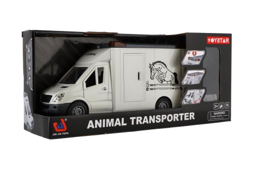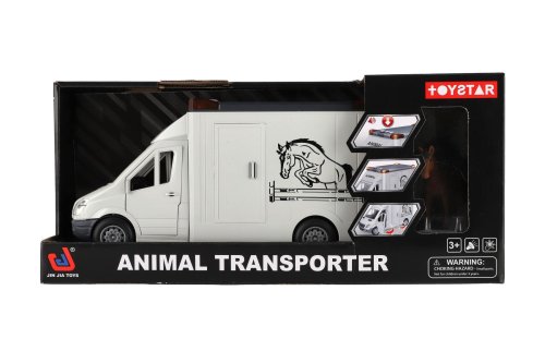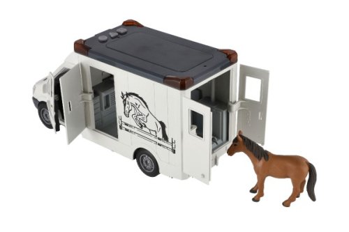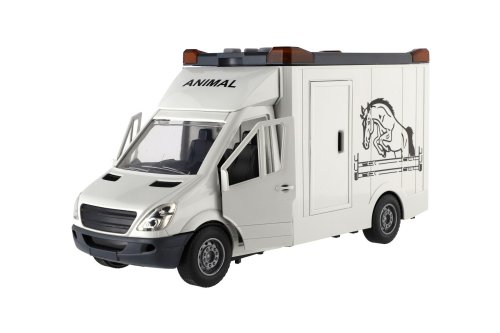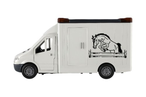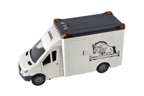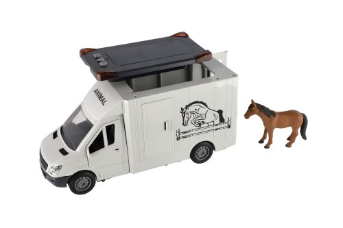 Auto na prevoz koní na zotrvačník. Všetky dvere sa dajú otvoriť. Súčasťou balenia je postavička koňa. Veľkosť auta je 28 cm a má svetelné a zvukové efekty. 2x AA batérie sú súčasťou balenia. Rozmery balenia 39 x 18 x 12 cm. Vhodné pre deti od 3 rokov.