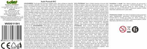Auto Pursuit 001 s efektmi RC na diaľkové ovládanie. Rozmery 29x11,8x7,5 cm. Frekvencia 2.4GHz. Svetelné efekty povrchu a zvukové efekty auta. 4xAA batérie do auta, 2xAA do ovládača nie sú súčasťou. Try Me tlačidlo pre svetelné a zvukové efekty v obale - 3xAG13 batérie (nemeniteľné) súčasťou. Pri vybaľovaní je nutné odpojiť Try Me kábel z auta. Rýchlosť 10 km/h. Dosah až 35 m. Prepínač ON/OFF na spodnej strane auta a na ovládači.
