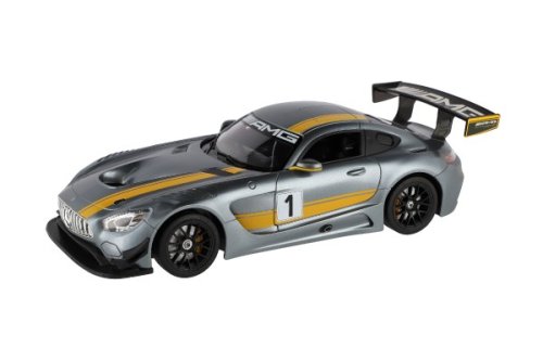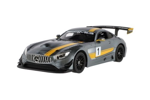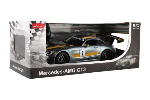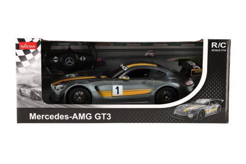 Krásny RC model auta Mercedes AMG GT3 v šedej farbe so žltými pruhmi. Ide o prepracovaný model s plastovými doplnkami. Auto je na diaľkové ovládanie v tvare športového volantu a dokáže sa pohybovať do štyroch smerov – dopredu, dozadu, doprava a doľava. Frekvencia je 2,4GHz. Mierka je 1:14. Do auta patrí 5x batéria AA, do ovládača 2x batéria AA, ktoré nie sú súčasťou balenia. Veľkosť auta je 35 cm. Prevádzková doba: 30 minút Vzdialenosť diaľkového ovládania: 20 metrov Rozmer balenia: 44 x 18 x 23 cm Vhodné pre deti od 6 rokov