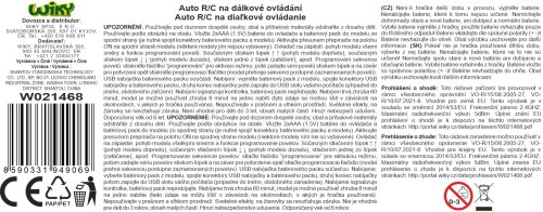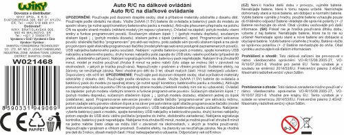 Auto RC na diaľkové ovládanie. Veľkosť 14 cm. Ovládač na zápästie. Frekvencia 2.4 GHz. Svetelné efekty. Programovanie. Auto batériový pack 3.7V, súčasťou ovládač 2xAAA nie sú súčasťou. Prepínač ON/OFF na aute. USB kábel súčasťou.