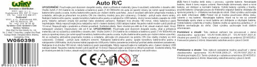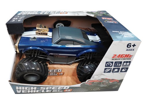 Auto RC na diaľkové ovládanie. Rozmery 43,5x29,5x27 cm. Pištoľový ovládač. Frekvencia 2.4GHz. Svetelné efekty. Batériový pack 7.4V 800mAh do auta súčasťou, 2xAA do ovládača nie sú súčasťou. USB kábel súčasťou. Prevádzka 15-20 min, nabíjanie 180 min, dosah 15-20 m. Prepínač ON/OFF na spodnej strane auta a na ovládači. Tlačidlo na ovládači.