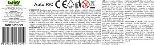 Auto RC na diaľkové ovládanie. Veľkosť 23 cm. Frekvencia 2.4 GHz. Svetelné a zvukové efekty. 3.7V 500mAh batériový pack súčasťou, 2xAA do ovládača nie sú súčasťou. USB kábel súčasťou. Prepínač ON/OFF na spodnej strane auta. Ovládač - Predné tlačidlá - pohyb kolmo vľavo a vpravo, tlačidlo - svetelné efekty, - tlačidlo - zvukové efekty, tlačidlo - auto (demo).