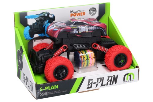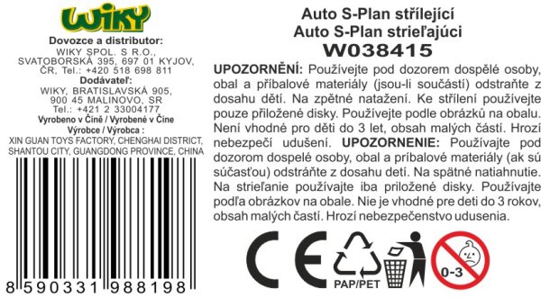 Auto S-Plan. Rozmery 17x10,2x10,2 cm. Na spätné natiahnutie. Vystreľuje disky. 6 variant.