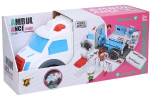 Auto sanitka rozkladacia s 2 figúrkami. Rozmery 30x9,5x14 cm. Voľné kolesá. Obsahuje, auto, vnútorné vybavenie, 2 figúrky, polepy. Obrázkový návod na zostavenie a používanie na zadnej strane obalu.