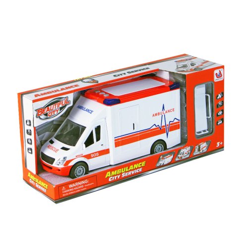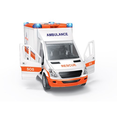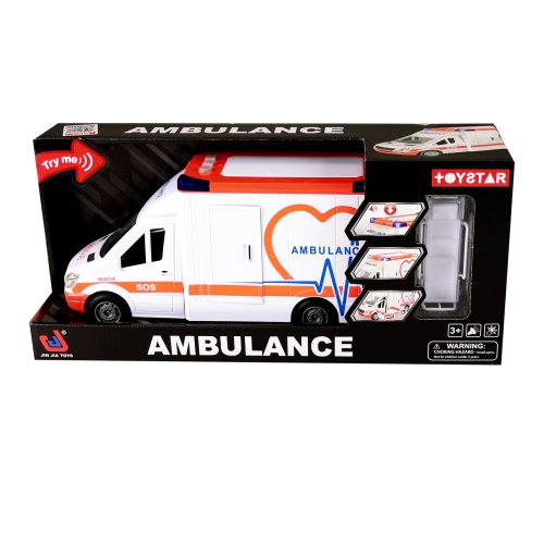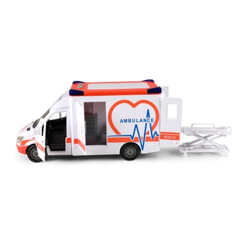 Auto sanitka s odnímateľnou strechou. Dĺžka auta 27 cm, všetky dvere sa dajú otvoriť. Svetelné a zvukové efekty, ktoré fungujú po vložení 2xAA batérií, ktoré nie sú súčasťou balenia. Súčasťou sady sú aj nosidlá.