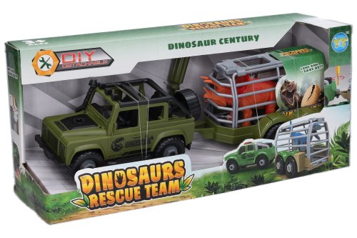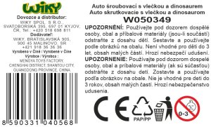 Auto skrutkovacie s vlečkou a dinosaurom. Rozmery 34x9x10 cm. Veľkosť auta 17 cm, dinosaura 14,5 cm. Na zotrvačník. Súčasťou skrutkovač.