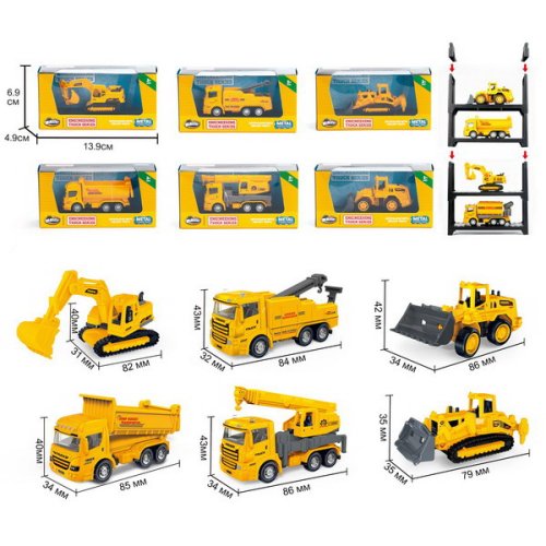 Auto stavebné kovové. Rozmery 8,5x3,4x4,3 cm. 6 variant - bager, odťahovka, nakladač, sklápač, žeriav, buldozér.