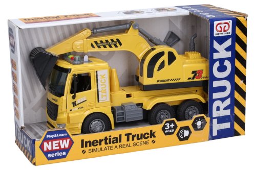 Auto stavebný bager na zotrvačník s efektmi. Veľkosť 28 cm. Vydáva svetelné a zvukové efekty. Aktivácia tlačidlami na streche (1 tlačidlo - zvuk motora, zvuk bagrovania, 2 tlačidlo - zvuk cúvania, zvuk trúbenia. Batéria 3xAG13 (1.5V), súčasťou balenia. Otvárateľné dvere, pohyblivé rameno bagru, na zotrvačník.