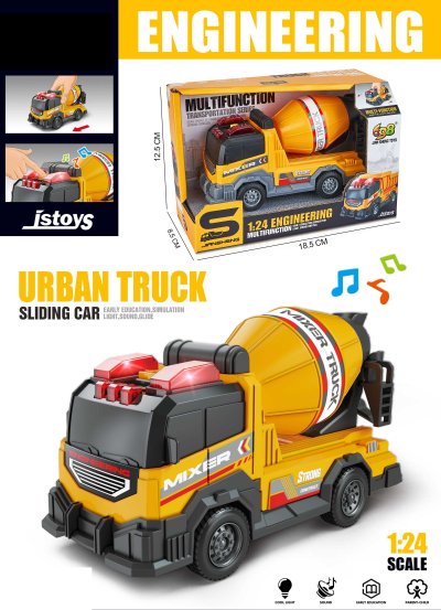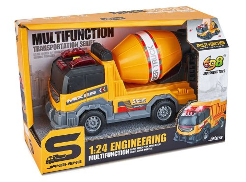 Auto stavebný domiešavač s efektmi. Veľkosť 16 cm. Voľné kolesá. Svetelné a zvukové efekty, aktivácia tlačidlom na streche. 3xAG13 batérie súčasťou.