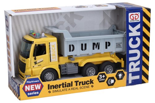 Auto stavebný sklápač na zotrvačník s efektmi. Veľkosť 28 cm. Vydáva svetelné a zvukové efekty. Aktivácia tlačidlami na streche. Tlačidlo 1 - zvuk motora, zvuk sklápania. Tlačidlo 2 - zvuk cúvania, zvuk trúbenia. Batéria 3xAG13, súčasťou (1,5V). Otvárateľné dvere, sklápacia korba (tlačítkom na strane), na zotrvačník.