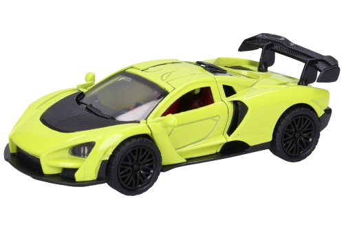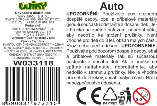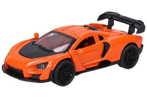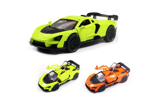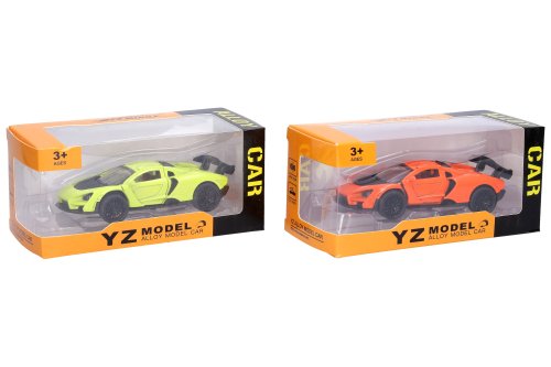 Auto kovové. Rozmery 12x5x3 cm. Na spätné natiahnutie. Otváracie dvere a zadné okno. 2 varianty - zelená, oranžová.