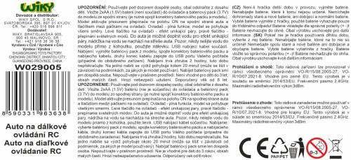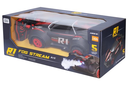 Auto závodné RC. Rozmery 28x16x8 cm. Svetelné a dymové efekty. 5 svetelných módov. Frekvencia 2.4 GHz. Rýchlosť 12 km/h. Batériový pack 3.7V 500mah do auta súčasťou, 2xAA batérie do ovládača nie sú súčasťou. USB kábel súčasťou. Nabíjanie 2 h. Prevádzková doba 25 min. Dosah 25 m. Prepínač ON/OFF na spodnej strane auta. ON/OFF tlačidlo medzi páčkami na ovládači. Ľavé tlačidlo na ovládači - dymové efekty. Pravé tlačidlo na ovládači - prepínanie svetelných módov. Nádržka na vodu na streche auta. Nádobka na vodu súčasťou.