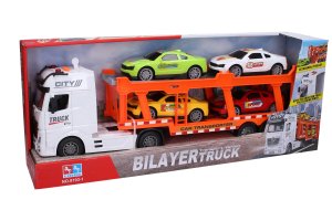 Auto ťahač na zotrvačník s autami set 4ks. Veľkosť ťahača 56x10,5x20 cm. Vydáva svetelné a zvukové efekty. Obsah balenia - ťahač 56 cm na zotrvačník, 4x auto 16 cm voľné kolesá. Ťahač - zvuk zvuk pohybu plošiny, zvuk cúvania, zvuk motora - aktivácia tlačidlami na streche. Batéria 3xAG13 (LR44) 1,5 V, súčasťou balenia.