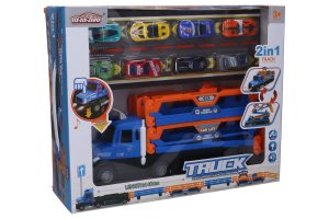 Auto ťahač s vystreľovacou dráhou na autá. Rozmery zloženého ťahača 34x9,5x18 cm. Dĺžka vystreľovacej dráhy v rozloženom stave 140 cm. Ťahač vydáva svetelné a zvukové efekty. Aktivácia stlačením kapoty. 2xAA batérie, nie sú súčasťou balenia. Súčasťou balenia je 8 kovových autíčok 6,5 cm, voľné kolesá.