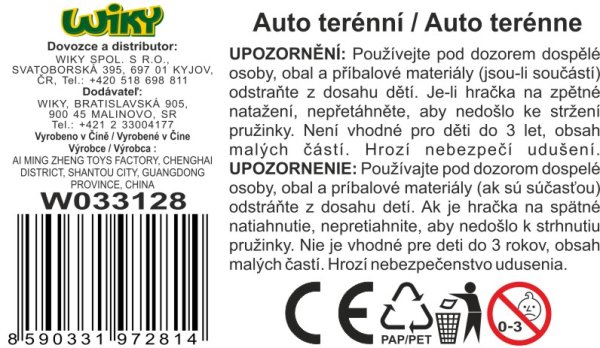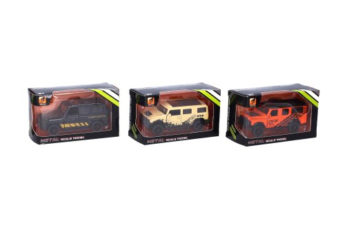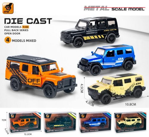 Auto terénne kovové. Rozmery 11x4,5x4,5 cm. Na spätné natiahnutie. Otváracie predné dvere. 4 varianty - oranžová, čierna, modrá, žltá.
