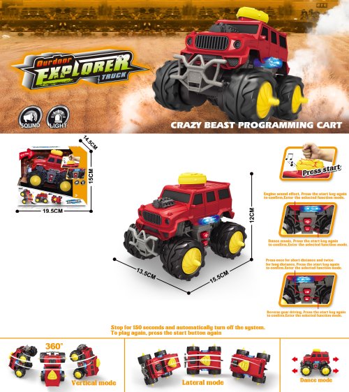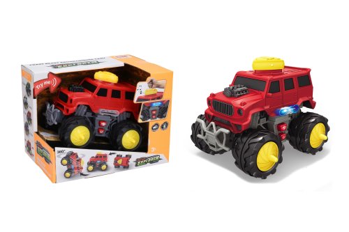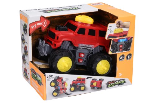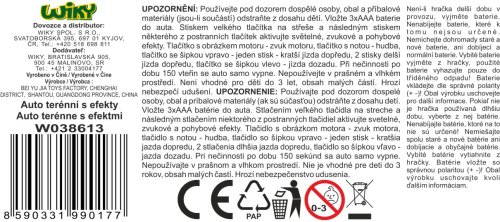 Auto terénne s efektmi. Rozmery 15,5x13,5x12 cm. Svetelné, zvukové a pohybové efekty tlačidlom na streche a postrannými tlačidlami (zvuk motora, hudba, jazda dopredu, dozadu). 3xAAA batérie súčasťou.