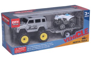 Auto terénne so štvorkolkou 25 cm. Auto na zotrvačník, príves a štvorkolka voľné kolesá. 2 varianty - šedá, žltá.
