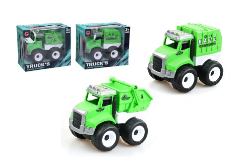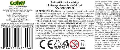 Auto upratovacie. Rozmery 16,5x11,5x12,5 cm. Na zotrvačník. Svetelné a zvukové efekty tlačidlami na kabíne. 3xAG10 batérie súčasťou. 3 varianty.