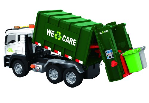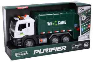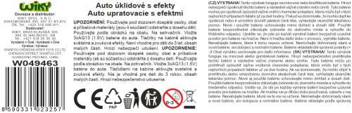 Auto upratovacie s popolnicami a efektmi. Rozmery 31,5x12,5x16 cm. Na zotrvačník. Svetelné a zvukové efekty tlačidlami na kabíne. 3xAG13 batérie súčasťou. Manuálne zdvíhanie nákladovej plochy veľkým tlačidlom na kabíne. Manuálne pokladanie nákladovej plochy páčkou medzi kolesami. Súčasťou 4 popolnice a odpadky. Popolnice je možné vložiť do zadnej časti auta a vysypať ich do nakladacej plochy podľa obrázkov na obale.