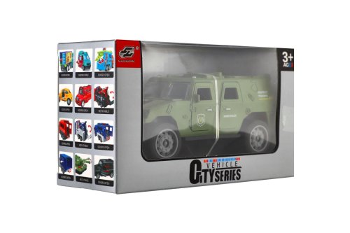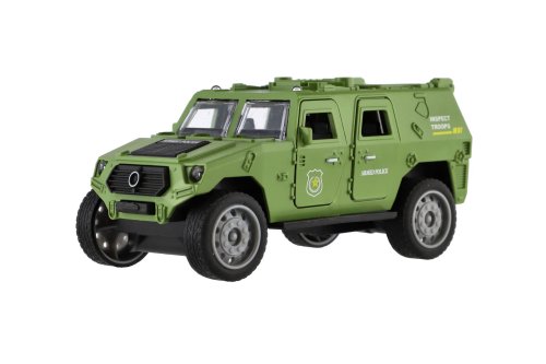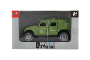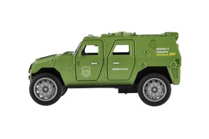 Vojenské auto s dĺžkou 13 cm je vyrobené z odolného plastu a vybavené mechanickým pohonom na zotrvačník, ktorý zaisťuje plynulý pohyb vpred po natiahnutí. Model v realistickom dizajne poteší všetkých malých milovníkov armádnych vozidiel a akčných scén. Balenie obsahuje jedno auto vo farebnej darčekovej krabičke, ideálne aj ako darček.