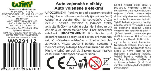 Auto vojenské s raketou. Veľkosť 19 cm. Na zotrvačník. Svetelné a zvukové efekty tlačidlami na kabíne auta. Pohyblivé odpaľovacie zarútenie. 3xAG13 batérie súčasťou.