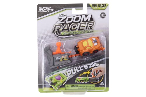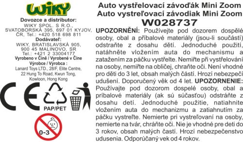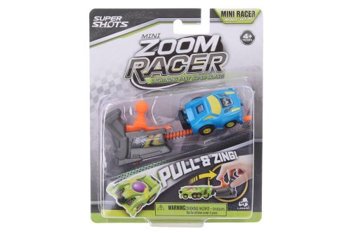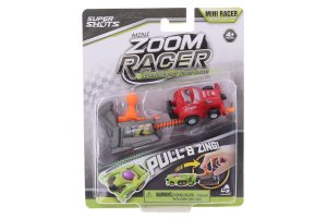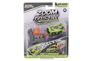 Auto vystreľovací závodiak Mini Zoom. Veľkosť 5 cm. 4 varianty - modrá, červená, žltá, zelená. Vystreľovací mechanizmus, natiahnutie pružinky. Obrázkový návod na obale.