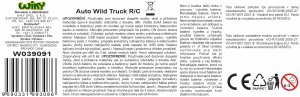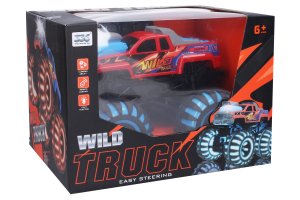 Auto Wild Truck so svietiacimi kolesami RC na diaľkové ovládanie. Rozmery 26,5x22x21 cm. Frekvencia 2.4GHz. Svietiace kolesá a motor - ľavým a pravým predným tlačidlom na ovládači. 7.4V 500mAh batériový pack do auta súčasťou, 2xAA do ovládača nie sú súčasťou. USB kábel súčasťou. Prepínač ON/OFF na bočnej strane auta, tlačidlo ON/OFF na ovládači.